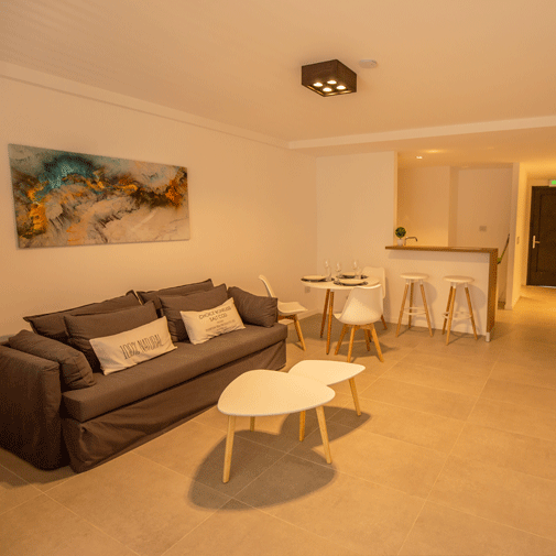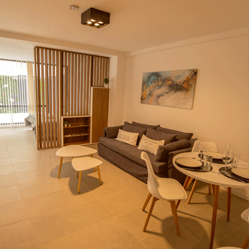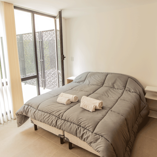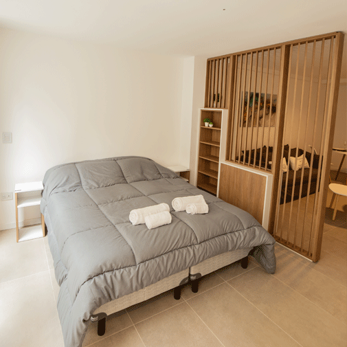 Amplio departamento que cuenta con un living comedor equipado con un espacioso sillón cama, adornado con múltiples almohadones, mesas ratonas, mesa de comedor con sillas, individuales, lámpara de pie, TV Led de 40”, y múltiples elementos de decoración. Separado por un mueble divisor de ambientes de diseño, se encuentra el dormitorio equipado con amplias y cómodas camas individuales, las cuales pueden unirse para convertirse en camas Queen. Cocina Integrada equipada con heladera, anafe eléctrico, horno microondas con grill, y todo el equipamiento necesario para su mejor estadía, desde vajilla hasta utensilios de cocina. Baño completo que incluye bidet. Y por si faltara algo más, Patio individual.