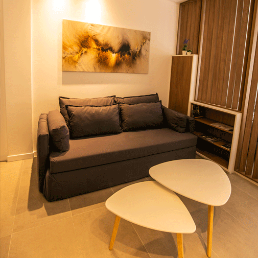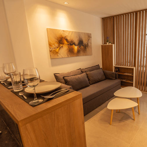 Amplio departamento que cuenta con un living comedor equipado con un espacioso sillón cama, adornado con múltiples almohadones, mesas ratonas, mesa de comedor con sillas, individuales, lámpara de pie, TV Led de 40”, y múltiples elementos de decoración. Separado por un mueble divisor de ambientes de diseño, se encuentra el dormitorio equipado con amplias y cómodas camas individuales, las cuales pueden unirse para convertirse en camas Queen. Cocina Integrada equipada con heladera, anafe eléctrico, horno microondas con grill, y todo el equipamiento necesario para su mejor estadía, desde vajilla hasta utensilios de cocina. Baño completo que incluye bidet. Y por si faltara algo más, Patio individual.